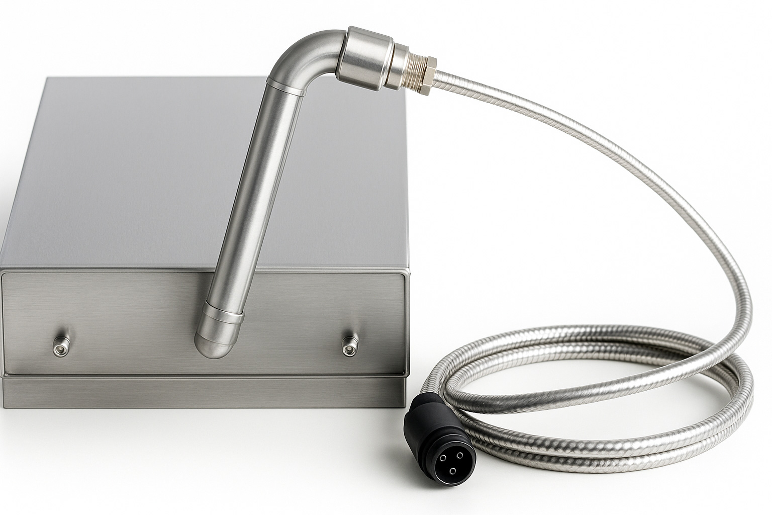 Standardmäßig besitzen die Tauchschwinger einen 1,5 m Industrie-Edelstahlgeflechtschlauch oder eine Festverrohrung als Anschluss für die elektrische Verbindung.